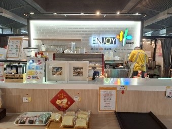 ENJOY臺北餐廳位於臺北市政府一樓南區通廊,店內共計58個座位數,舒適悠閒的用餐環境,伴隨著憨兒真切熱情的服務,讓前來洽公的您緩下繁忙的腳步,細細品嚐手作烘焙品、商業午餐及香醇的公平貿易咖啡茶飲,在緊湊的行程中獲得一段愜意的時光。