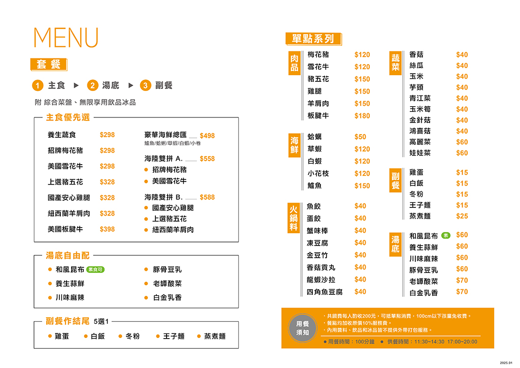 本店提供無限供應飲料、冰品,您只需要選擇主食、湯頭及附餐,保證滿滿飽足感。另設有喜餅專區:提供新人喜餅洽詢及試吃服務。