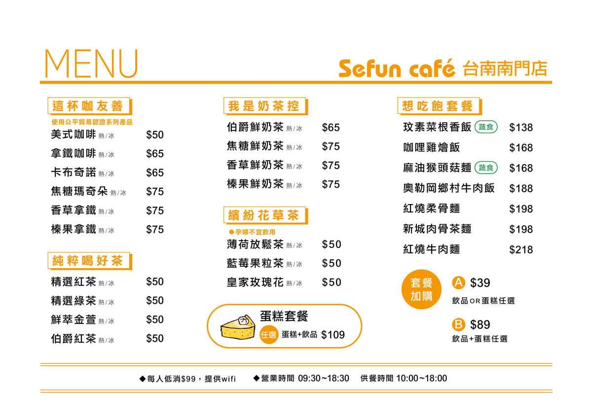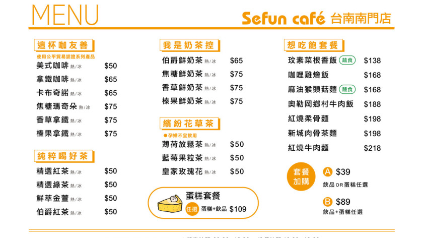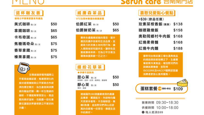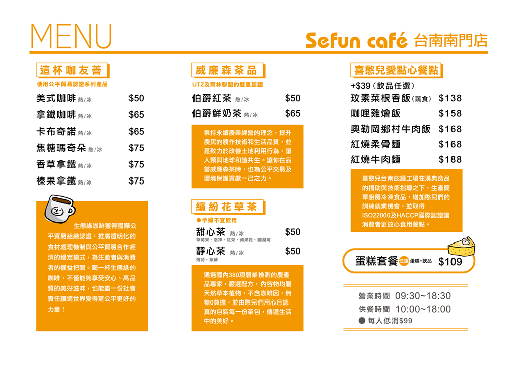 Sefun Café台南南門店位於中西區南門路上,隣近孔廟商圈,提供安心飲食(手搖茶、咖啡、蛋糕和愛點心餐點),以及喜憨兒庇護工場商品(餐盒/手工餅乾/伴手禮/節慶禮盒)。歡迎您親臨體驗我們的孩子用心服務的感動。