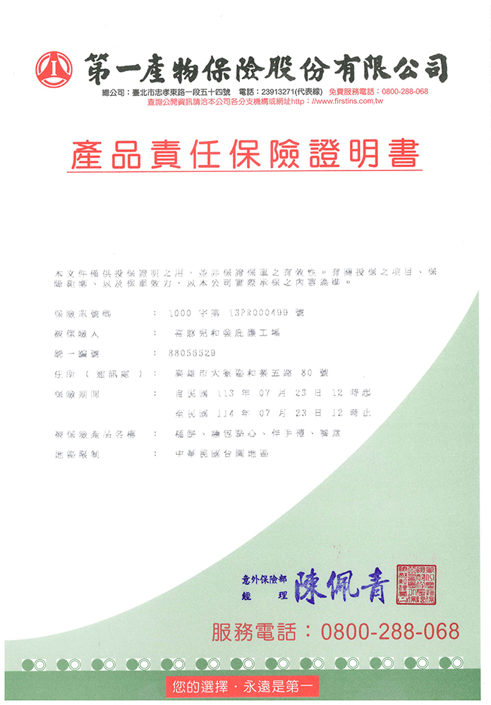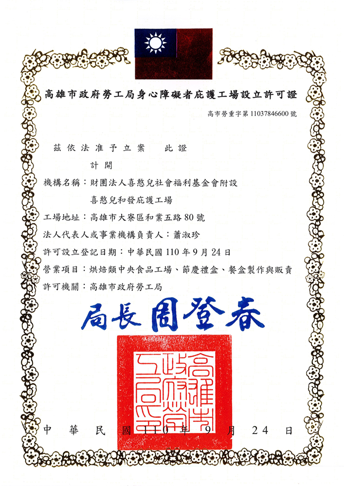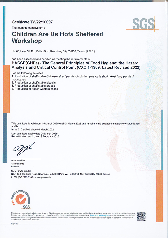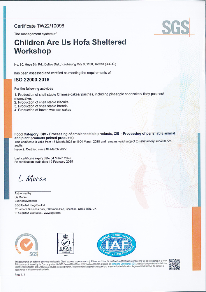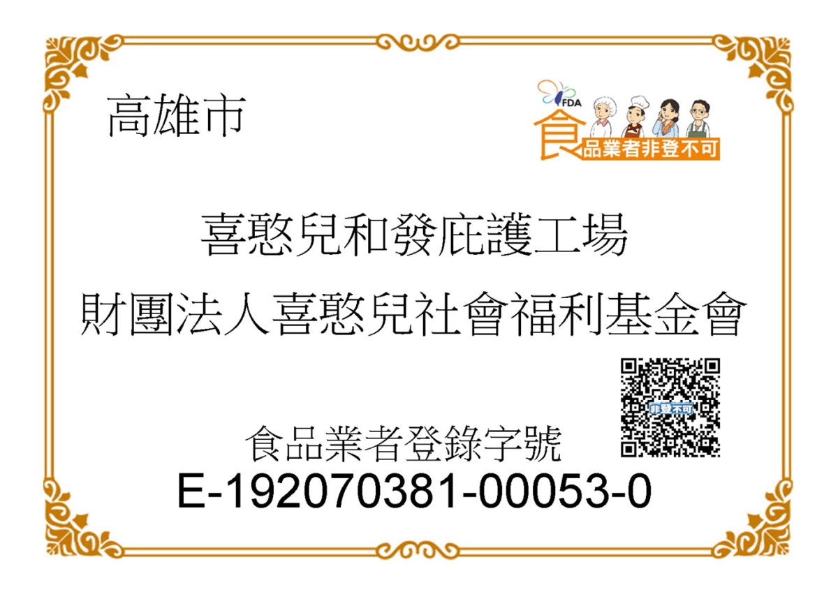為了讓消費者能更放心的食用『喜憨兒高雄庇護工場』所生產製造的西點、麵包等相關烘焙品,全面提高產品品質與衛生,本工場成功導入食品衛生安全ISO22000及HACCP國際認證,並活用該制度,精進各項設備與流程,提供更多工作機會給憨兒們,秉持更嚴謹的態度,把關各項產品,確保品質與安全,提供消費者最安心與滿意的保證。