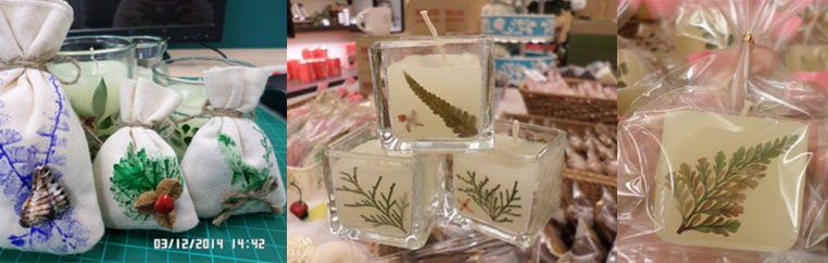 憨喜玩手作的原料主要是以天然素材為主,大多出自於憨喜農場。原始棉布的質感拓印上親手採集的葉片,再蓋上天鵝堡專屬的印記,最後填入自然乾燥的香草,自由混搭喜愛的香味,創造出獨一無二的香包;農場內多樣的植物隨著四季更迭,提供了源源不絕的押花題材,點綴著香氛裊裊的蠟燭,舒緩緊張的情緒營造出慢活的腳步。