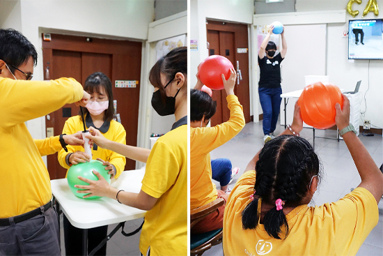 「樂齡極球運動」是其中一項深受憨兒喜愛的體適能活動,一開始先為自己的瑜珈球「打氣」,接著在影片及工作人員帶領下,手持瑜珈球進行極球運動,結束後再用力擠壓瑜珈球將空氣釋放,每個看似簡單的過程,其實都融合了手眼協調、肌力、心肺等不同功能的練習,讓乏味的訓練變得有趣,也讓憨兒們更認識自己的身體機能。