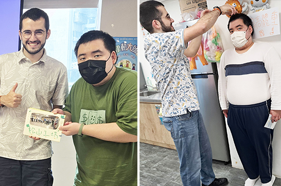阿勛心思細膩、待人友善,是松山工坊裡人見人愛的小天使。雖然口語表達能力較弱,但他非常喜歡與人互動。因緣際會下,松山工坊與隔壁的松山天主堂建立了深厚的情誼,從今年一月開始,每週四都會有一位法國志工到工坊陪伴憨兒們一起參與活動。