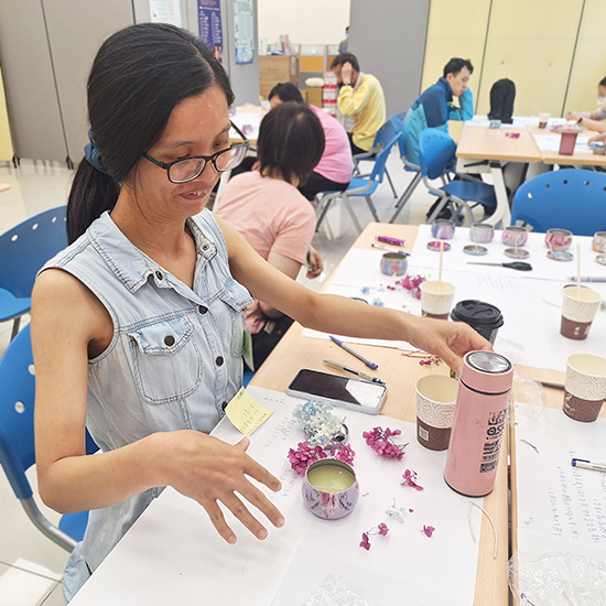 講師柔和而有節奏的聲音,與每一滴落入融蠟中的精油一起沉穩而安定。香氣緩緩在空間流動,像替每個人輕輕按下生活裡的「暫停鍵」。小魚攪拌著,手穩了又抖;倒入模具時,她屏住呼吸,把乾燥花輕輕放在表層,就像替自己的心意蓋上一枚溫暖的印章。