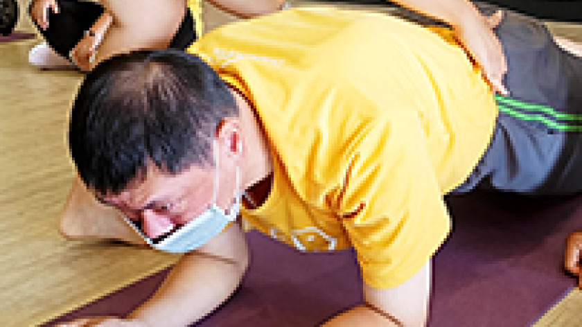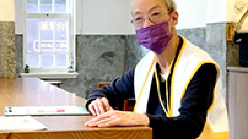 位於長安西路的中山茶書院,禮拜六來時會在外場看到一位穿者背心的憨兒志工,他叫做世正,也是喜憨兒中華門市工作的同仁,他志願休假時來茶書院擔任志工。