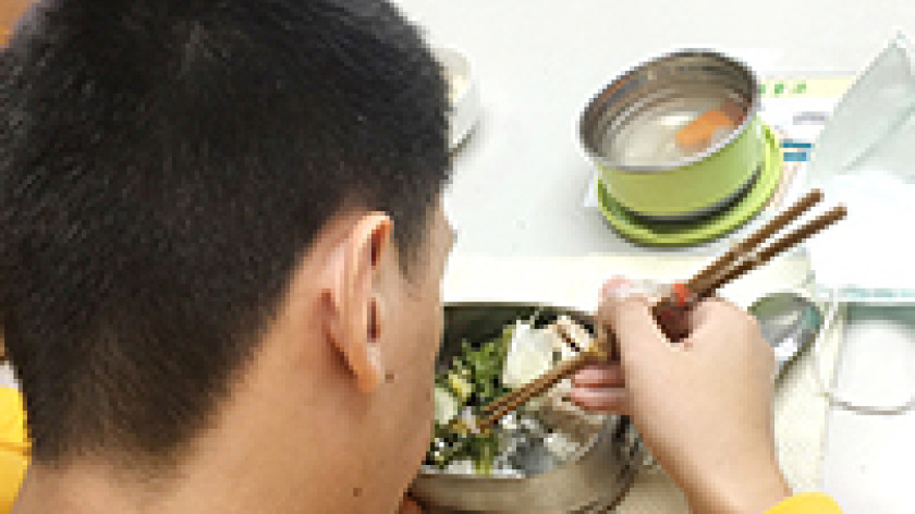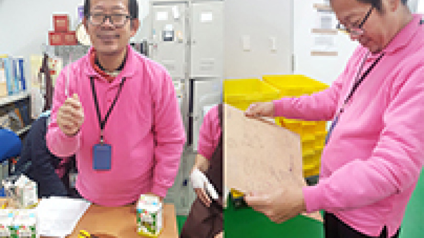 小蓉,現年31歲,智能障礙輕度,目前在竹北工場服務已有2年半,綁著短小馬尾的她,臉上常表現出靦腆害羞的表情,口語表達出輕聲細語,過去的她可是個裸包區的得力助手。