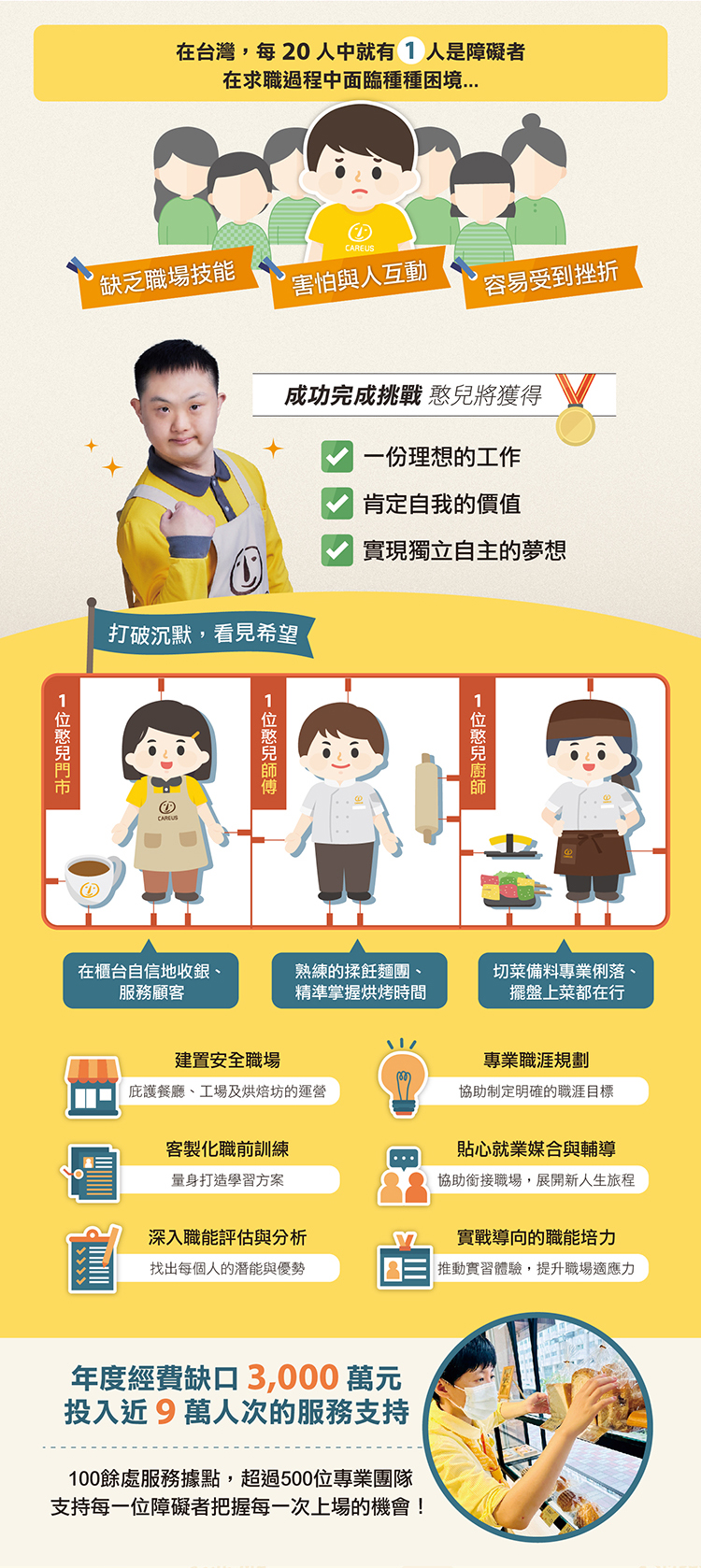 在台灣,每20人中就有 1 人是障礙者,在求職過程中面臨缺乏職場技能、害怕與人互動、容易受到挫折種種困境...。