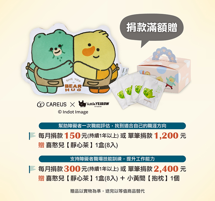 ✪ 靜心茶:1.8公克,一盒/8入茶包,成分包含檸檬香茅、薄荷、薰衣草、馬鞭草。 ✪ 抱枕:尺寸(約)寬36cm*高27cm。 ✪ 紀念品以實物為準,送完以等值紀念品替代。 ✪ 單筆捐款紀念品恕不累計。 ✪ 收據與紀念品將分別包裝寄送,感謝您的溫暖相挺! ✪ 勸募字號:衛部救字第1131363529號。