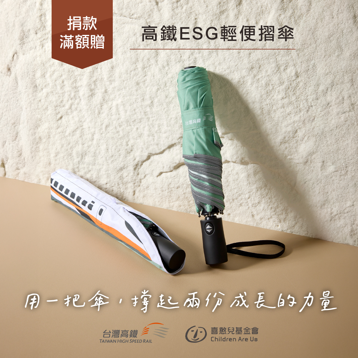 每月定期500元(12個月以上)或單筆捐款6000元,即可獲得【高鐵ESG輕便摺傘】