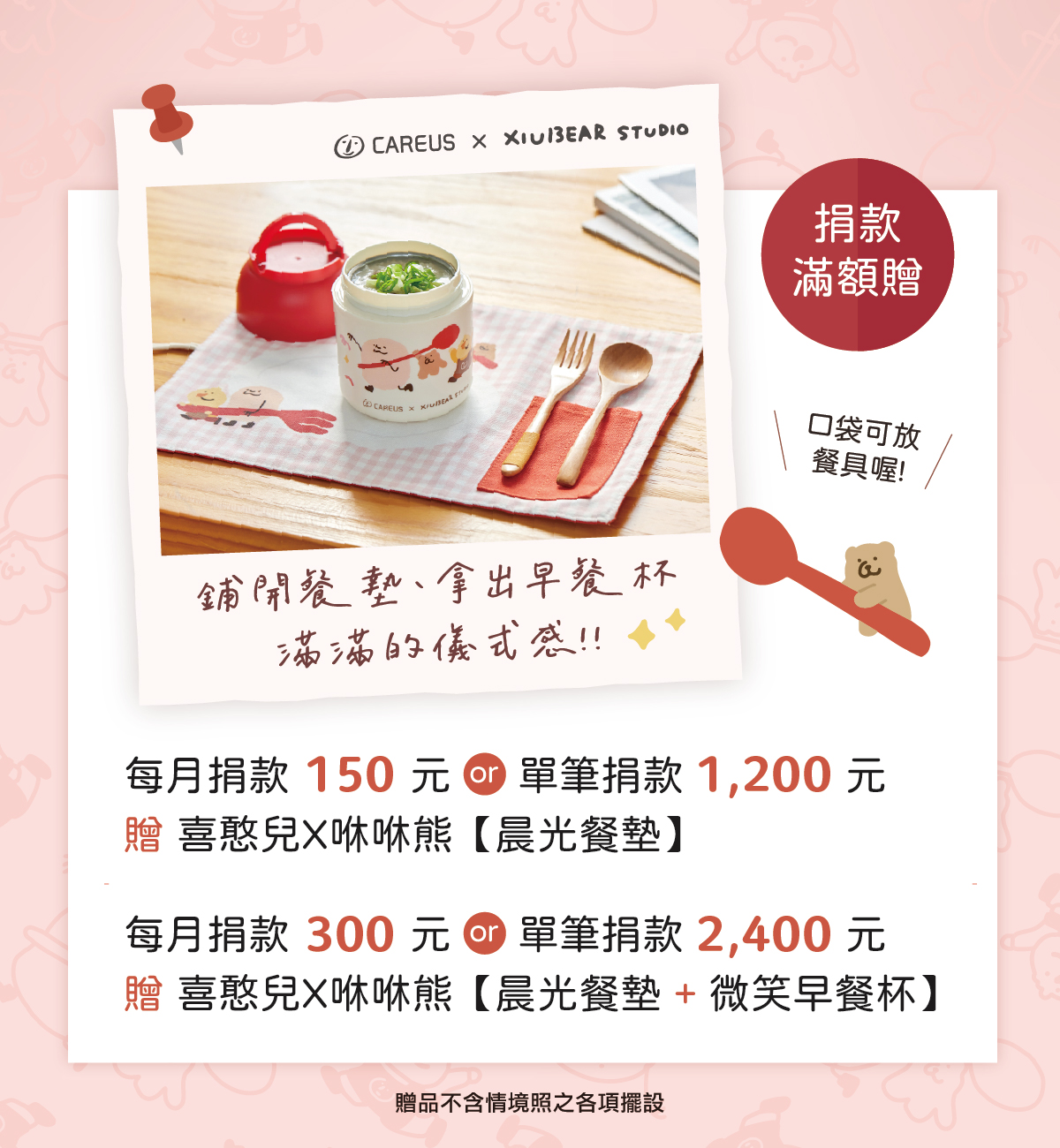 🧡 每月捐款 300元(持續一年以上),或 單筆捐款 2,400元,即可獲得人氣插畫家咻咻熊 獨家繪製:【晨光餐墊× 微笑早餐杯】一組
