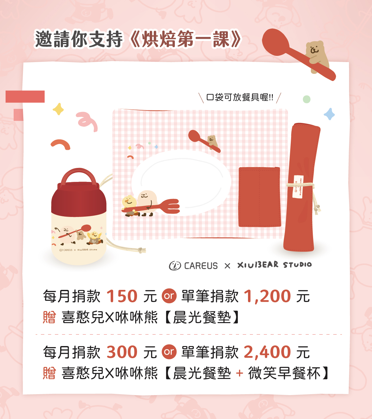 🧡 每月捐款300元,或 單筆捐款2400元,即可獲得人氣插畫家咻咻熊 獨家繪製:【晨光餐墊× 微笑早餐杯】一組