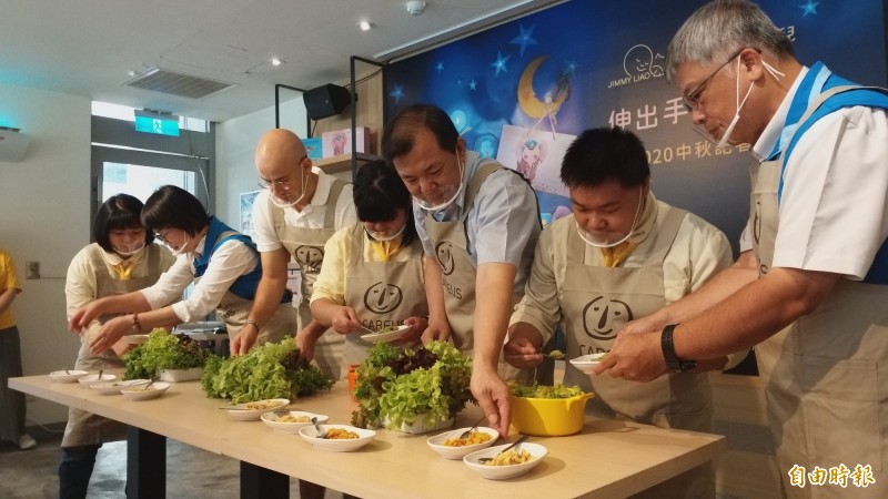 喜憨兒基金會中秋禮盒發表會,公益大使吳鳳(左3)和與會來賓一同與憨兒完成創意料理「月餅健康沙拉」,號召民眾支持憨兒。(記者廖雪茹攝)
