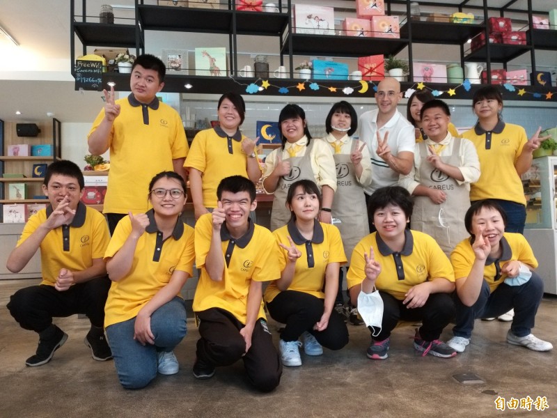 公益大使吳鳳(前排左1)誇讚,喜憨兒月餅相當美味,台灣協助身心障礙者就業,是一個先進國家才能做到的事,在他的國家土耳其沒有月餅,相信外國人收到也都很喜歡。(記者廖雪茹攝)