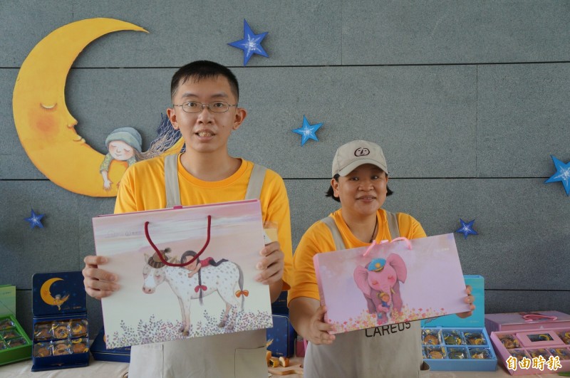 憨兒店員展示「擁抱」中秋聯名限量禮盒。(記者黃旭磊攝)