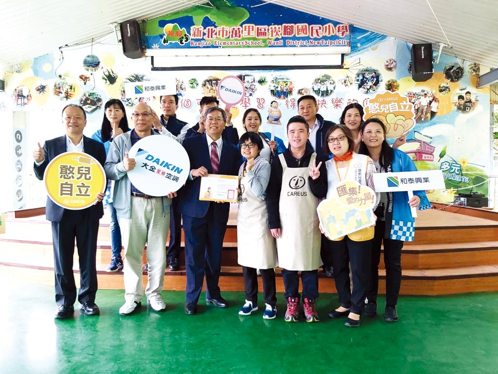 推動社會公益,關懷偏鄉學童,代理日本大金(DAIKIN)空調的和泰興業公司4日攜手喜憨兒基金會將將手工餐盒送往萬里鄉崁腳國小的21位學童。和泰興業總經理林鴻志現場加碼贈送現金五萬元,勉勵同學努力學習成長,創造屬於自己的未來。
