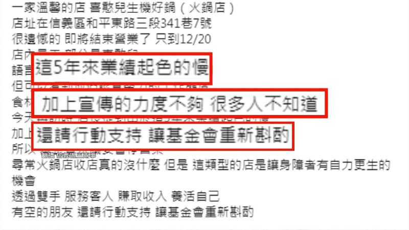 民眾分享收攤訊息,有員工透露這5年業績起色慢,加上宣傳力度不夠,很多人不知道,希望大家用行動支持讓基金會重新斟酌。多數網友也留言稱讚服務、菜色都不錯,絕對不輸其他火鍋店,很捨不得。