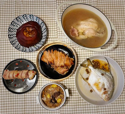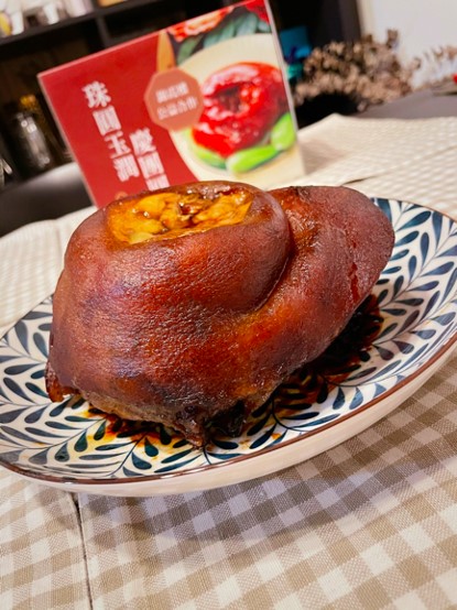 老編自己很喜歡吃肉,所以這次的菜色都是以肉食為主,不但有鯧魚、干貝雞湯,那已經料理好的蹄膀真的方便很多。另外讓人驚豔的醉雞腿,味道相當豐富,擺盤起來也很喜慶。但因為分享的這時候還沒過年,所以特別擺盤選溫馨感,等過年時只要換套餐具就很有感覺了。