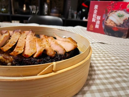 「金牛銀春財源滾」年菜組合的「黃金松阪豚吉祥油飯」。