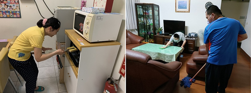 圖左/小潁勤練習烤土司。圖右/家園住民們整理家務