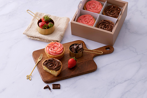 擁有漂亮貝殼外型的瑪德蓮,口感柔軟而濕潤,充滿濃郁的奶油香氣;精緻奢華的法式茶點,有原味、莓果以及巧克力等三種口味。法式瑪德蓮禮盒,每盒8入特價360元。季節限定的草莓塔,是將草莓乳酪餡裝飾成夢幻玫瑰造型,酸甜內餡與塔皮的奶香融合,酸甜又濃郁!更有選用比利時巧克力製成的巧克力塔,香醇迷人、苦甜不膩,兩種口味一同享用、甜蜜加乘。花間相遇玫瑰塔禮盒,每盒4入特價399元。