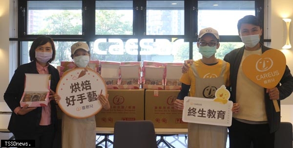 剛出爐的餅乾傳來陣陣奶油香,伴隨著包裝機規律運作的聲響,憨兒們一早就忙個不停,揉麵糰、整形切割、再送進烤箱,最後按照步驟、有條不紊地把商品包裝得漂亮整齊,生產即將出貨給凱撒衛浴公司的餅乾禮盒。(見圖)