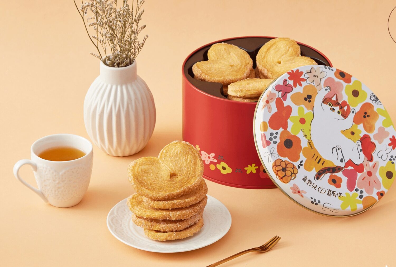 新款雙層鐵盒內含七款手工餅乾,包括幾米造型餅乾、喜憨兒Logo笑臉餅乾、羅蜜西亞餅乾、白巧克力杏仁餅乾與千層蝴蝶酥等。產品兼具文創與美味,無論是節慶贈禮、企業伴手禮或婚禮小物,皆為萬用且具收藏價值的選擇。另同步推出「花悅繽紛千層蝴蝶酥鐵盒」(售價450元),以法式層疊工法製成,香氣濃郁、造型浪漫,適合個人品嚐或節慶回禮。兩款禮盒大量訂購滿百盒以上可享85折優惠。