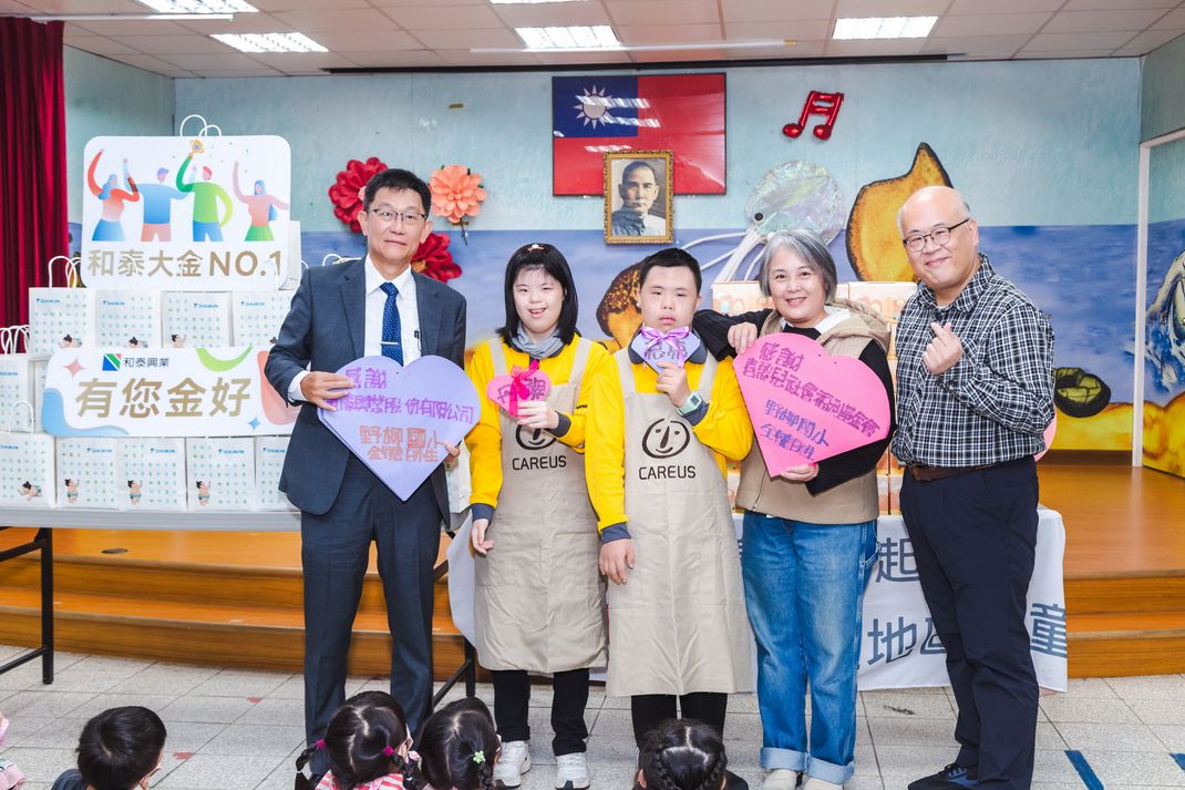 送愛活動由新任總經理陳永澤帶領員工代表一同參與,並與喜憨兒亮亮、小蜜蜂協力將新鮮出爐的餐盒親送進校園。基金會特別感謝和泰大金長期支持,讓憨兒透過烘焙訓練獲得穩定就業及職能培養,同時也讓偏鄉學童感受到社會的關懷。