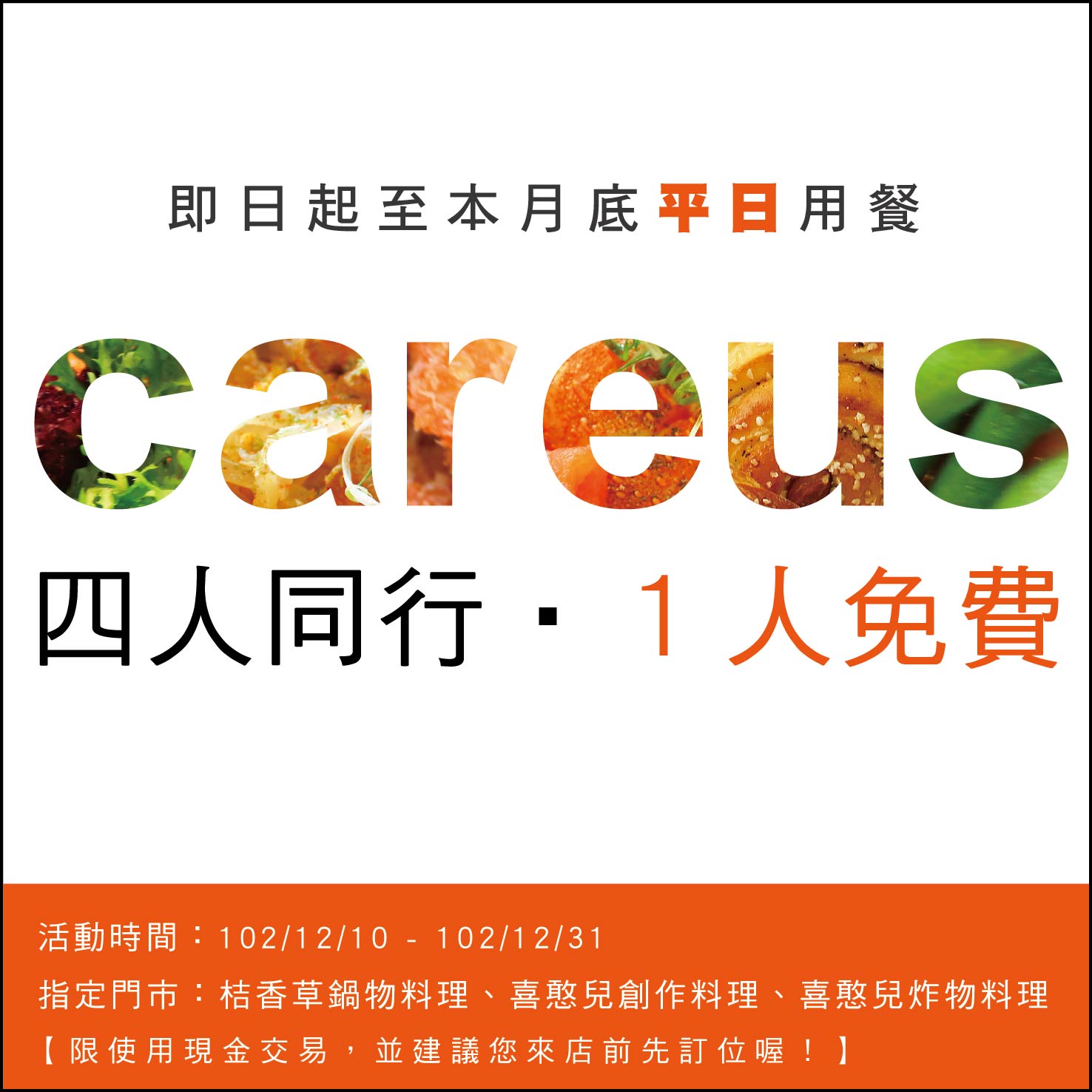 凡於平日至喜憨兒高雄區指定門市用餐,即可享四人同行一人免費優惠。