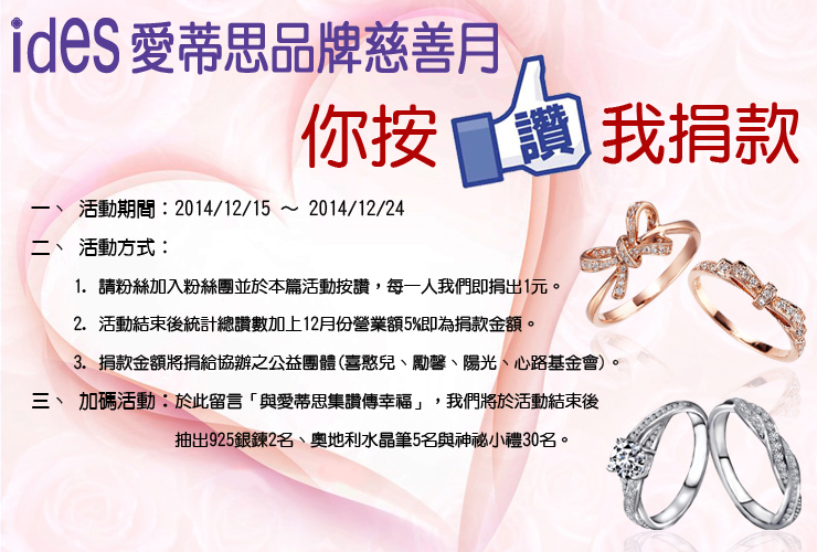 愛蒂思珠寶體現「跟著愛,乘著夢,遇見璀璨新幸福」的企業精神,以提供鑽石專業為基礎,喚醒人們對幸福及美好的憧憬,將幸福傳給每個熱愛生活的人。以幸福作為品牌使命,希望傳遞與分享更多幸福,每年12月都是ides的慈善月,今年度除捐出12月份各通路營業額5%,並於活動期間內邀請民眾點選粉絲團與活動文章讚,每按1個讚即加碼捐出1元。營業額5%及粉絲團活動所得總金額平均分予四家公益團體,喜憨兒社會福利基金會為其一受贈單位。