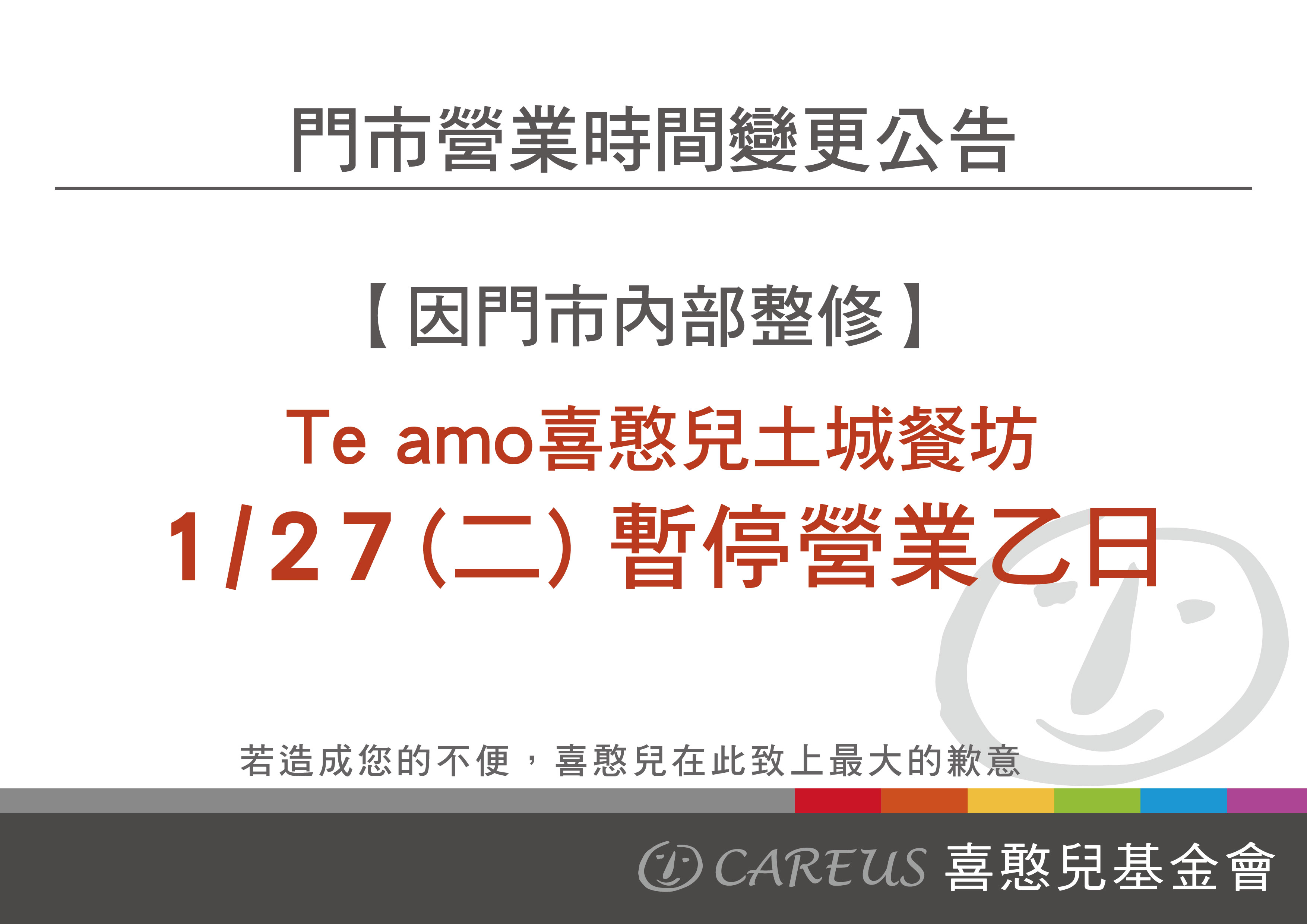 Te amo喜憨兒土城餐坊 1/27暫停營業乙日公告
