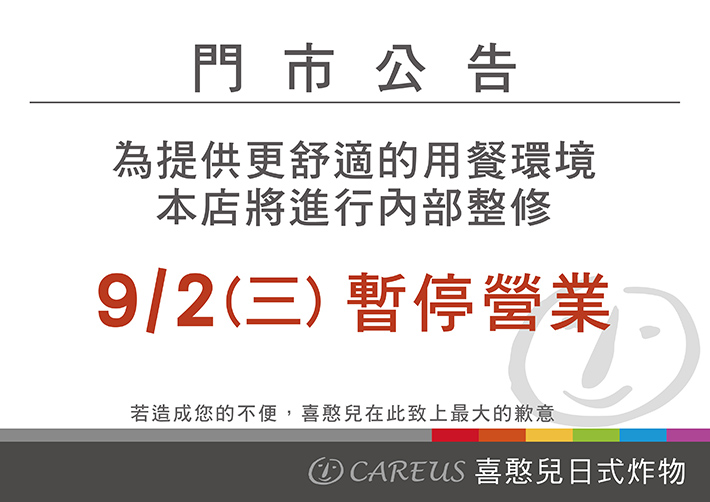 喜憨兒日式炸物料理 9/2 暫停營業公告