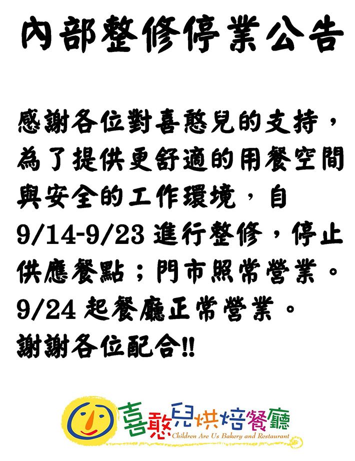 喜憨兒新竹建中餐廳 整修暫停營業公告