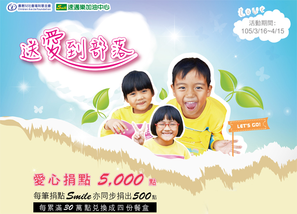 即日起至4/15邀請會員朋友一起至全台統一精工加油站捐點獻愛,消費者每捐出5000點,Smile亦同步捐出500點,期待能夠募得2000盒愛心餐盒,為偏鄉部落孩子帶來營養,也為憨兒的工作機會開啟了一扇窗,學童在陽光下快樂的奔跑、憨兒在工場開心的做著餐盒,這份美麗,需要您持續的力量