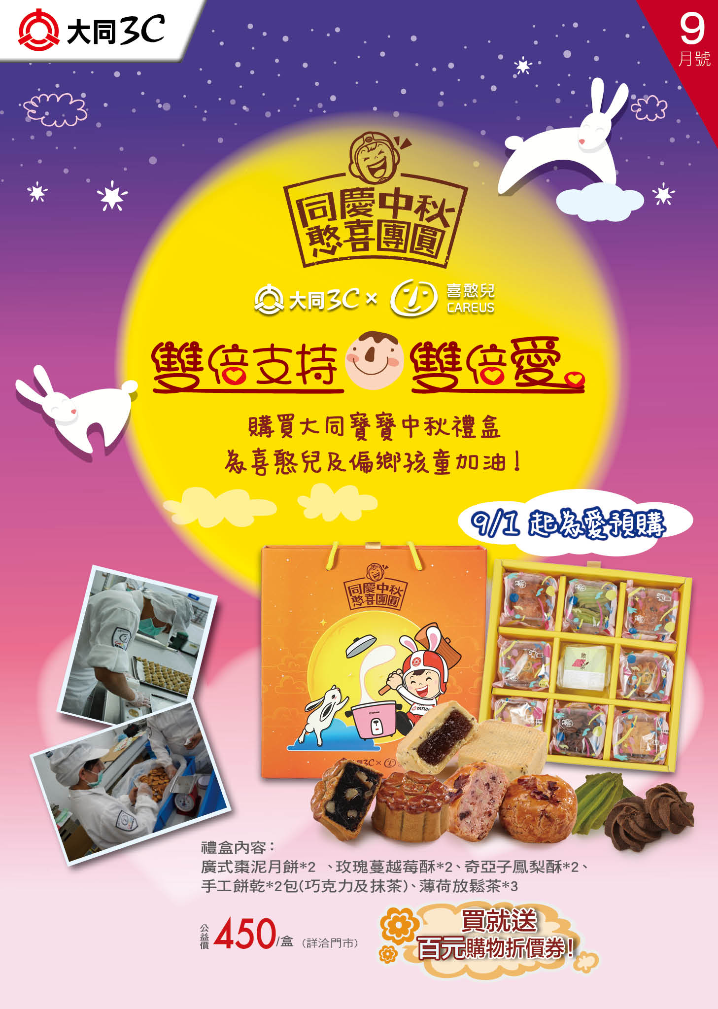 公益合作 大同3C X喜憨兒 ❤大同寶寶中秋禮盒❤ 2017-09-05 分享 每年中秋都是喜憨兒工作訓練的具體展現,透過一顆顆的月餅,傳遞出憨兒家庭面對挑戰的勇氣與希望。今年喜憨兒基金會與大同3C共同推出《大同寶寶中秋禮盒》,即日起於全台大同3C門市接受預購,每買一盒就送一張大同3C百元購物折價券,喜憨兒與大同3C邀請你一起吃甜甜做公益! ★限量3000組,數量有限售完為止 ❤ ★禮盒內容:廣式棗泥月餅*2、玫瑰蔓越莓酥*2、奇亞子鳳梨酥*2、薄荷放鬆茶*3、手工餅乾*2包❤ ★大同3C門市看這裡❤