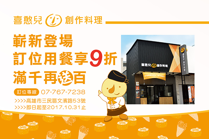 門市 喜憨兒創作料理 嶄新登場 訂位用餐享9折 2017-09-26 分享 好消息!好消息!小編等了好久滿心期待的喜憨兒日式創作料理 換裝嶄新登場囉 歡迎老朋友 新朋友揪團一起來,用行動支持憨兒用心的手作料理現在訂位用餐還享9折優惠 滿千再送百喔!