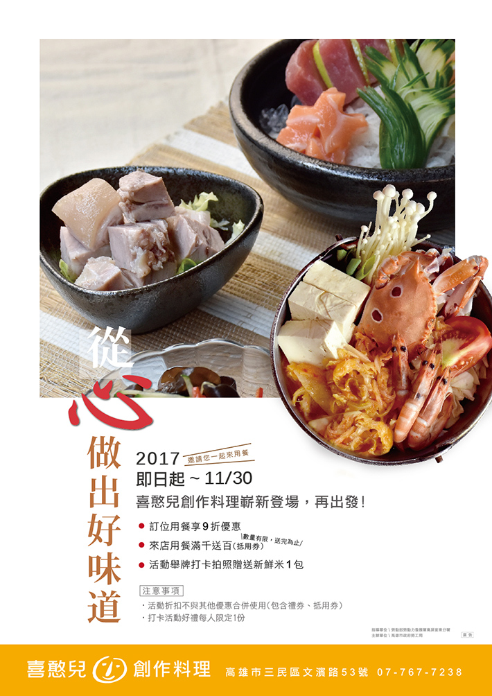 一般 從心做出好味道,喜憨兒創作料理,新菜上市! 2017-11-01 分享 新推出獨家手工黃金泡菜,嚴選整顆白菜,以手工按摩取代高鹽分醃漬方式,添加營養豐富牛番茄以食材天然色素增添泡菜色澤,口感脆嫩、入喉濃郁甘甜。黃金泡菜天然水果酸甜口感,搭配東港新鮮配送三點蟹、新鮮蔬菜與滑嫩豆腐烹煮而成的蝦兵蟹將黃金泡菜鍋,在逐漸寒冷的天氣中,帶來滿滿暖意。即日起至2017/11/30 訂位用餐享9折,滿千再送百喔! 喜憨兒創作料理 高雄市三民區文濱路53號 訂位電話 : (07)767-7238