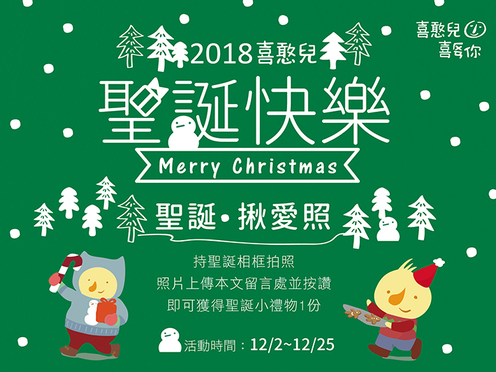 一般 聖誕.揪愛照 2018-12-05 分享 聖誕快樂! 到喜憨兒門市手持聖誕相框 和現場的憨兒、朋友、家人、愛人合照 在本文活動訊息留言處上傳照片並按讚 幫我們加油打氣 就可獲得聖誕小禮物 1 份 活動期間:107/12/05 ~ 12/25