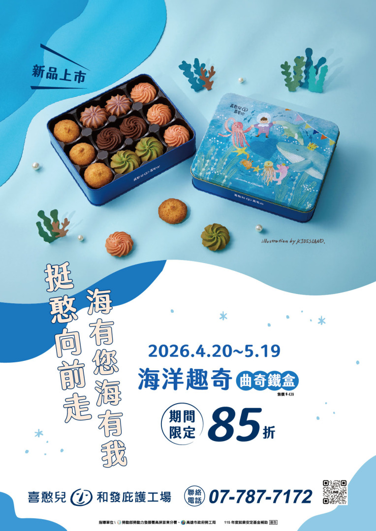門市 挺憨向前走 海有您~海有我~ 2026-04-27 分享 🚌🌊 海洋趣奇上路啦!曲奇鐵盒全城出沒中你看見了嗎?一台載著海洋與美味的公車,正悄悄經過你身邊 👀💙「挺憨向前走,海有您海有我」這趟旅程,不只在海裡,也來到城市街頭,與你相遇。打開海洋趣奇曲奇鐵盒,五款療癒美味,就像一場小小冒險每一口,都是與可愛夥伴的驚喜邂逅 🐚📣 新品上市・限時優惠中📅 活動期間|即日起~ 5.19✨ 期間限定|85 折(原價 $439)👉和發工場訂購專線:07-7877172