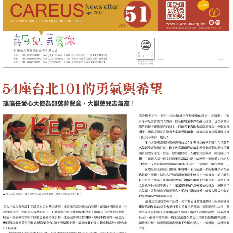 54座台北101的勇氣與希望瑤瑤任愛心大使為部落募餐盒,大讚憨兒志氣高!更多詳細的內容,請閱讀本期期刊…