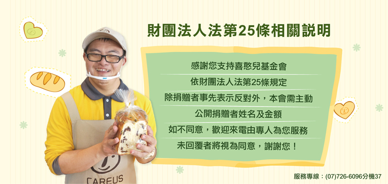 一般 財團法人法第25條相關說明 2019-05-02 分享 親愛的捐款人您好, 依財團法人法第25條規定,除捐贈者事先表示反對外,本會需主動公開捐贈者姓名及金額,如不同意, 歡迎填具回覆表單或來電07-7266096#37由專人為您服務,未回覆者將視為同意,感謝您的愛心,喜憨兒,謝謝您! 關於財團法人法:https://law.moj.gov.tw/LawClass/LawAll.aspx?pcode=I0020030